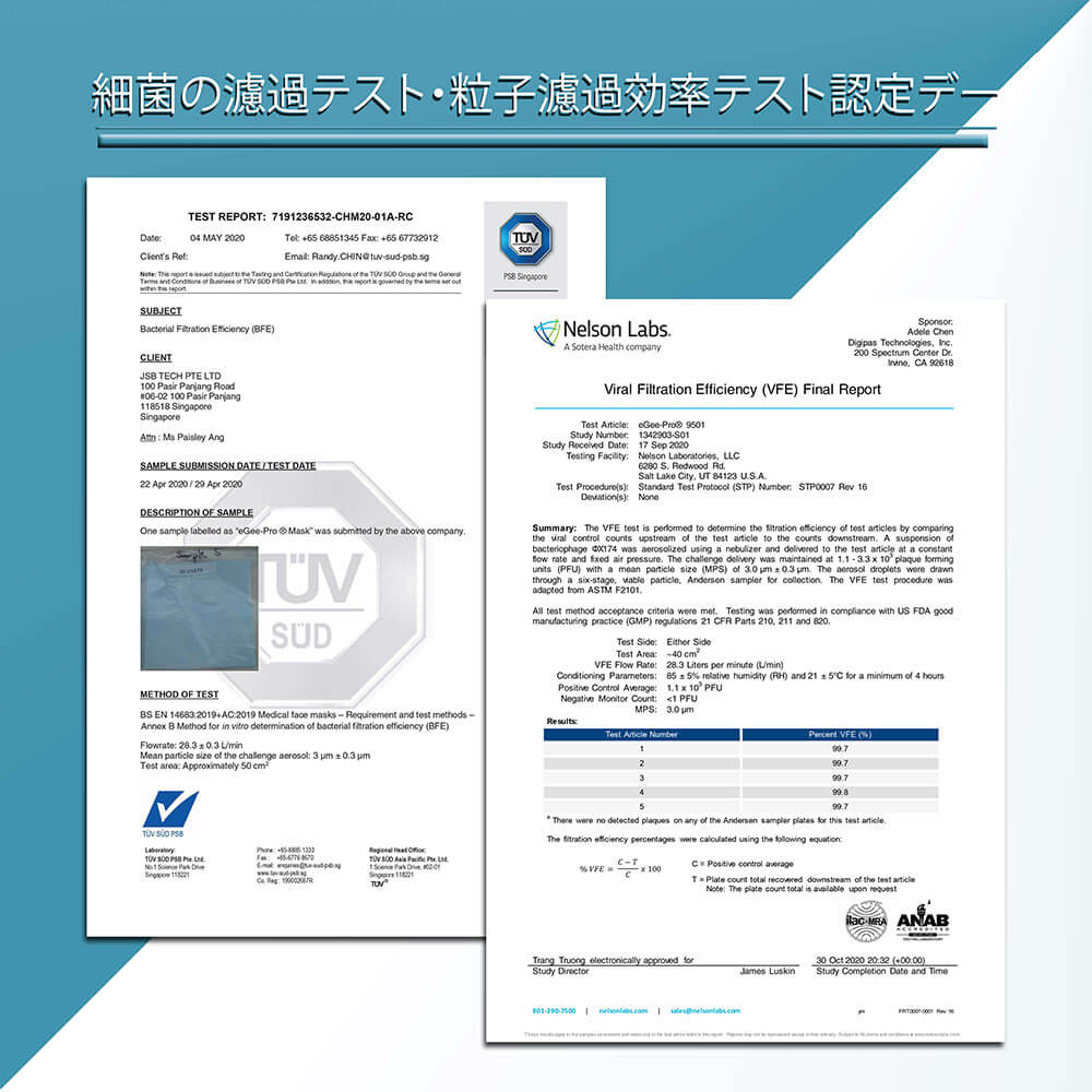 eGeePro® Reusable Face Maskの抗菌フィルター素材は、ヨーロッパと米国のサージカルマスク試験基準用に認定されたドイツの試験機関(Europe : EN14683 / USA : ASTM F2100 Standard, Europe Respiratory : EN149:2001-A1:2009 Standard)のテストをクリアした素材を使っています。これはアメリカのNIOSHによるN95規格に相当する認定で、最も捕集しにくいと言われる0.3μmの微粒子を99%以上捕集できることが認められています。