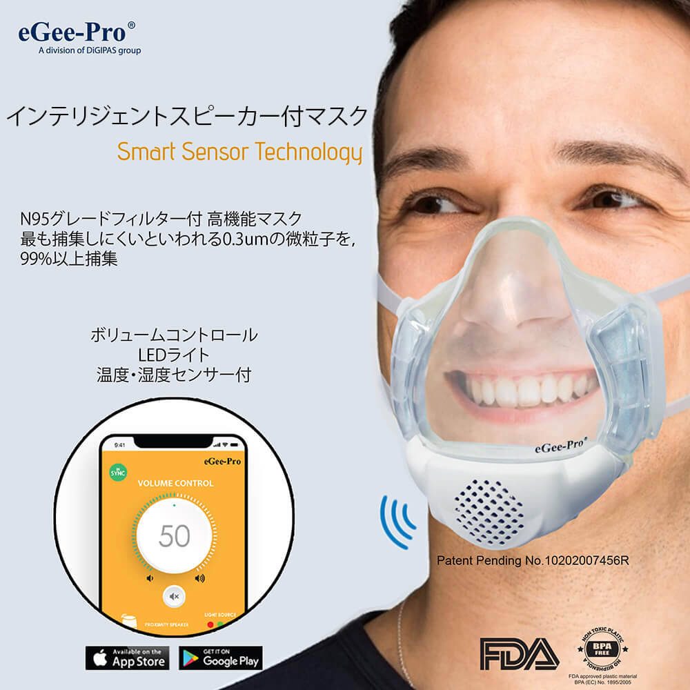 世界各国で長引くコロナ禍においてN95規格と同グレードの高機能抗菌3層式フィルターレフィルが付いたeGee-Pro® 繰返し使える軽量マスクに続き、対話やコミュニケーションを円滑に行える高機能フィルター付きのスピーカー付マスクをリリースしました。透明カバーで表情が見える上、スピーカーモジュールで音量を調整できます。マスク本体はゆったりサイズで顔面と接触する部分だけが柔らかクッションになっているので、顔面とマスクの隙間を最小限にして飛沫の飛散や吸入を防ぎます。男女問わず着用いただけます。