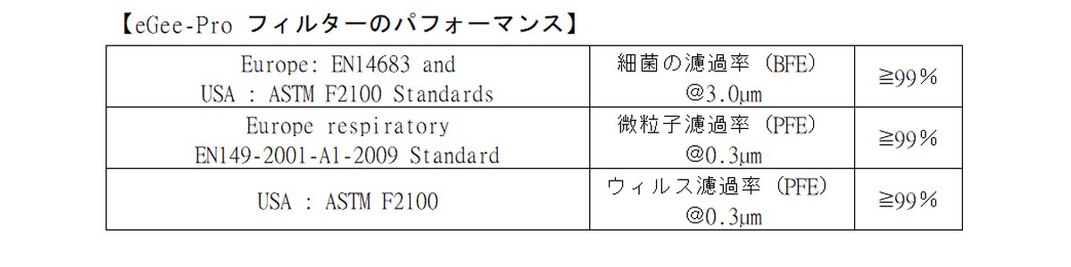 高性能抗菌フィルターの濾過性能(BFE(細菌濾過率)99%及び、PFE(微粒子濾過率)99%):ヨーロッパと米国のサージカルマスク試験基準用に認定されたドイツの試験機関の捕集効率試験(Europe : EN14683 / USA : ASTM F2100 Standard, Europe Respiratory : EN149:2001-A1:2009 Standard)で、最も捕集しにくいと言われる0.3μmの微粒子を99%以上捕集できることが認定されています(Product Quality Certifications 参照)。これは米国のNIOSHによるN95規格と同グレードです。